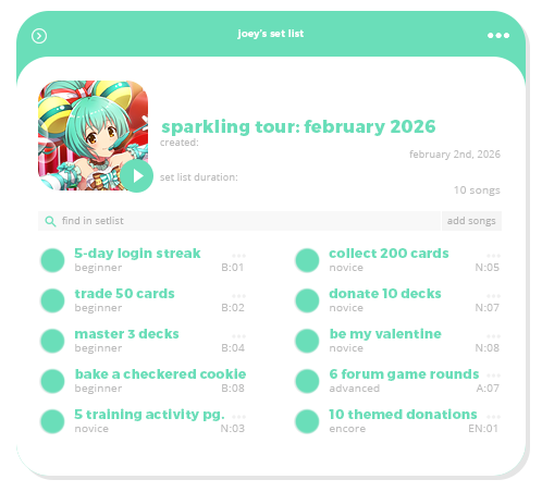 | Deck Mastery (citti-proofofmysoul): moa-heartfulheartbeats09, moa-heartfulheartbeats10, mariohara-dazzlingocean11, proseka-sweetsweetvalentine06, azusamiura-destinedvalentine06, hokutohidaka-gallantnorthstar21, uzukishimamura-winterlights12, +1 exp